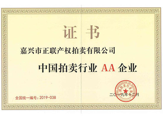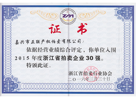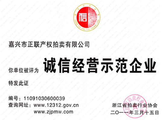 公司坚持“公开、公平、公正、诚实信用”的原则,热情、优质、高效服务,获得了“海关指定拍卖行”、“中国拍卖行业AA级企业“资质,并连续被市工商行政管理局评为“重合同守信用单位”;2011-2015年度连续入围浙江省拍卖企业30强。